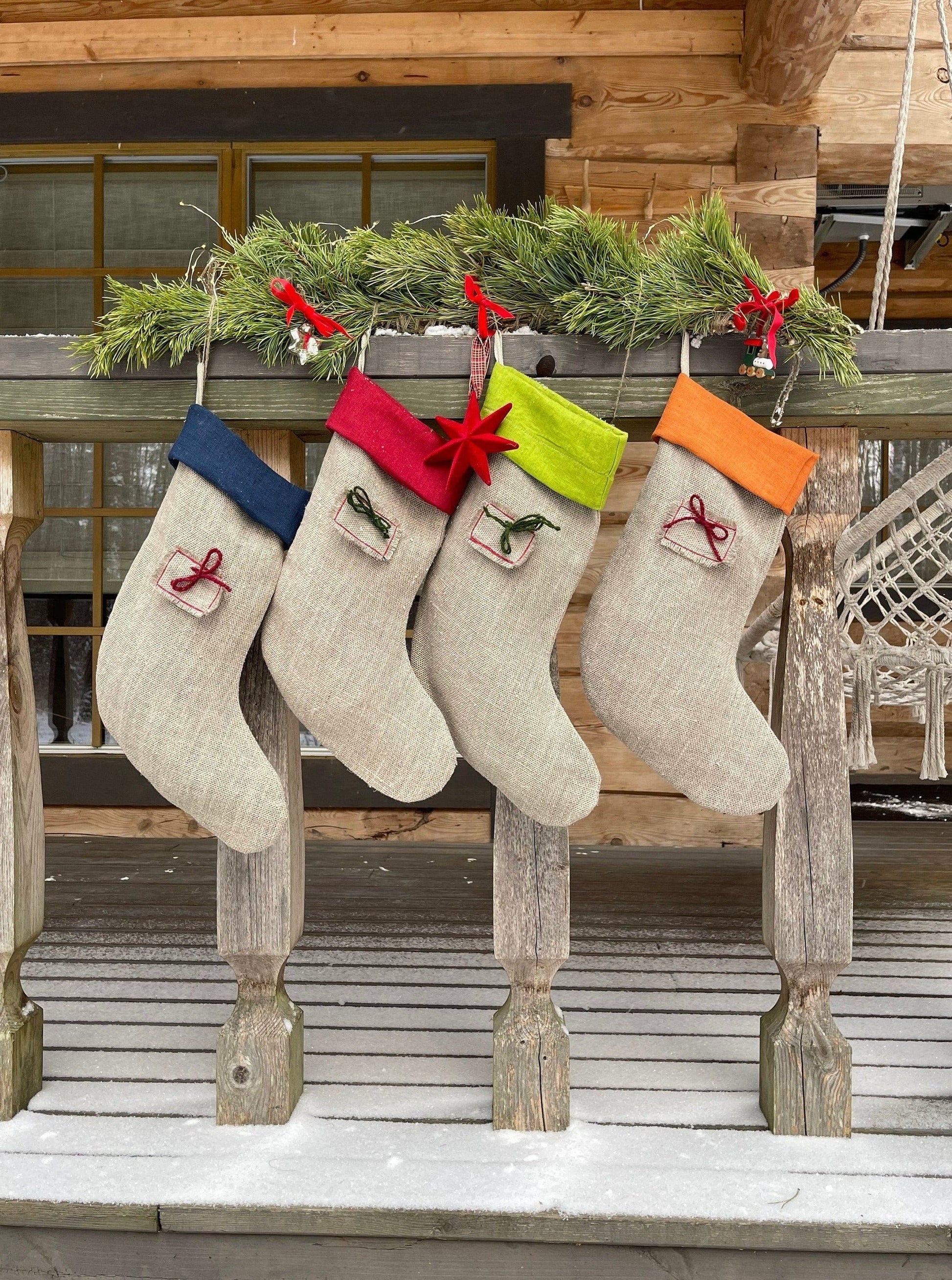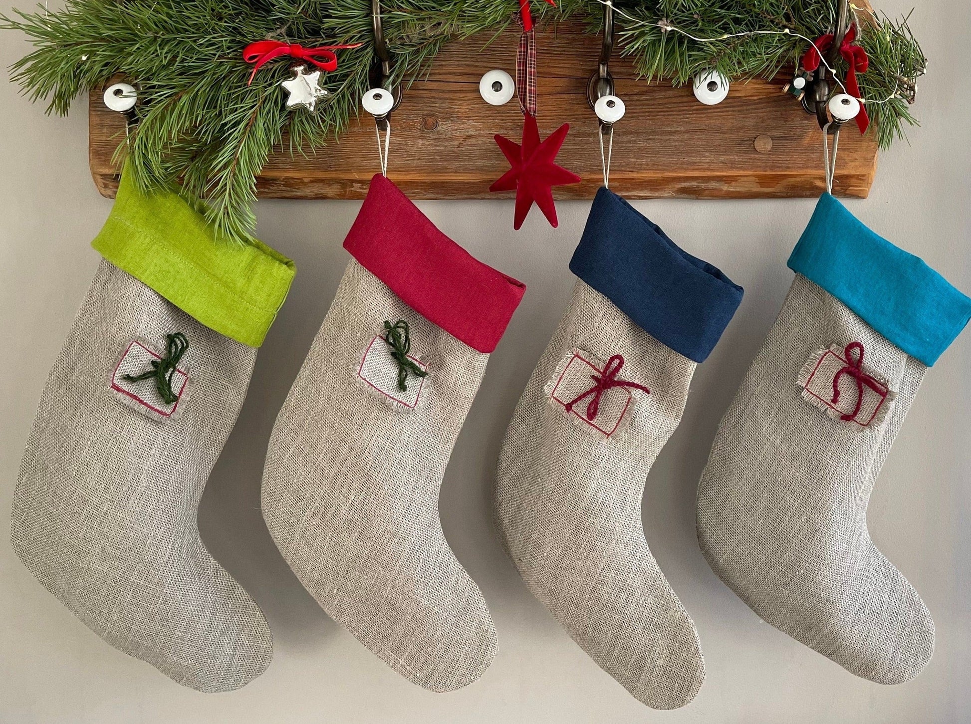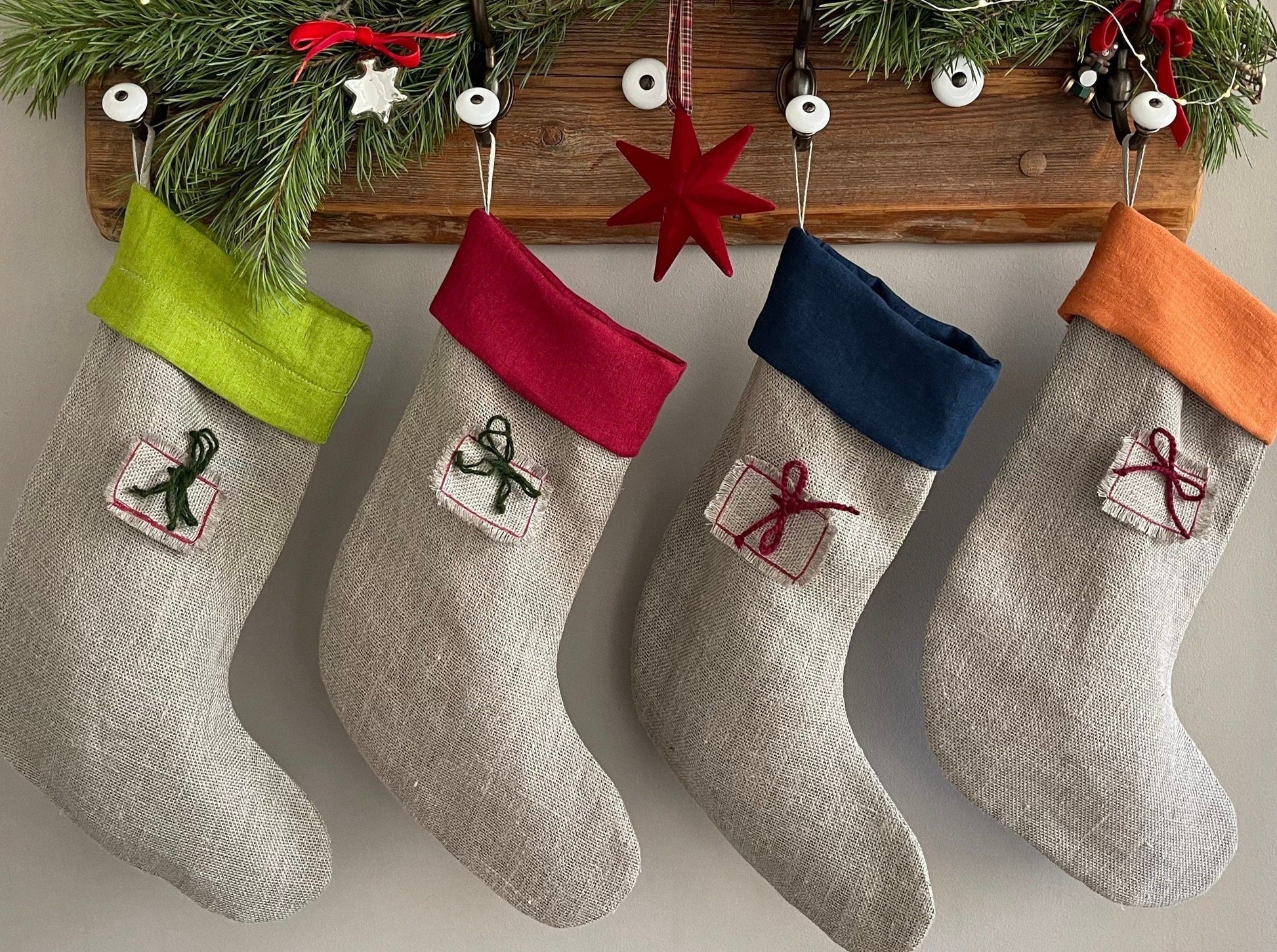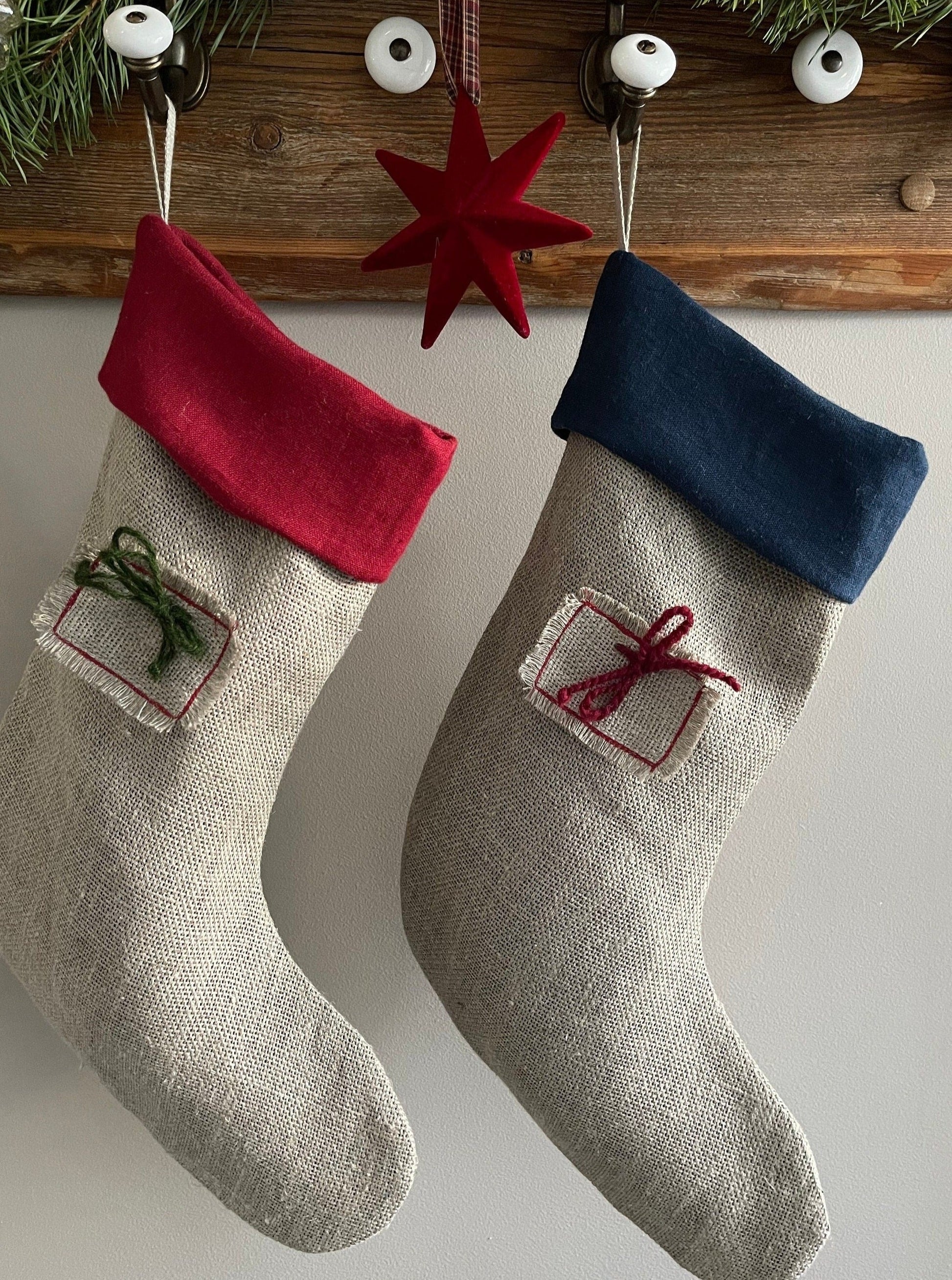 Christmas linen stockings in traditional style are the ideal gift or decor for Christmas time. The socks are sewn using scraps of fabric from our other products, so we take care of sewing with no additional waste. The inner fabric is a colored fabric that can be seen as a decorative element on the sock's lapel, they are of different colors. The outside of the socks is a rough raw linen color linen fabric, both are 100% linen. A linen ribbon is sewn into the sock, behind which it can be attached in the desired place. A name tag can be attached to the label holder. The sock size is around 38 x 28 cm/15x11”. The price for one sock is 32.81€.